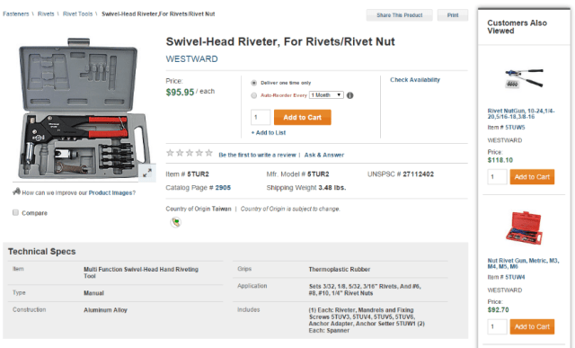 Below you have examples of similar products marketed by Amazon, and Grainger, an industrial supplies company. The look and feel adopted by Grainger is very close to that of Amazon, although the B2B nature of the site is highlighted by the auto-reorder function and prominence of the UNSPSC code.